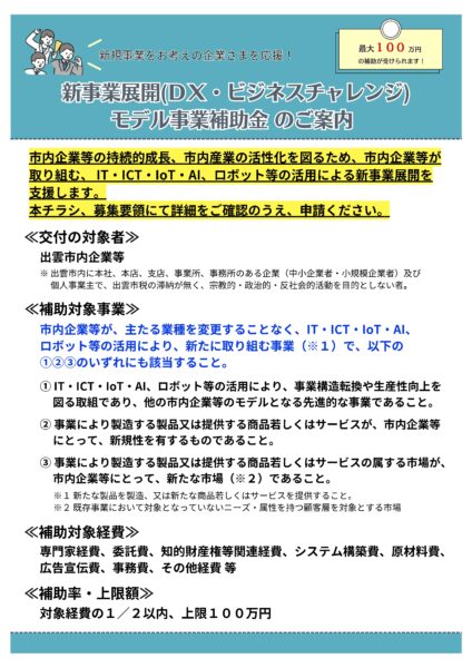 出雲市内企業等の持続的成長、市内産業の活性化を図るため、出雲市内企業等が取り組む、IT・ICT・IoT・AI、ロボット等の活用による新事業展開を支援します。